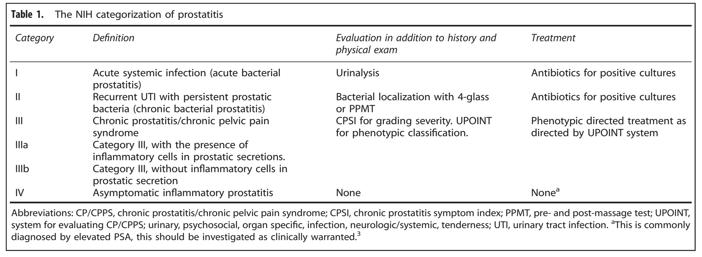 Los Institutos Nacionales de la Salud (NIH) en los Estados Unidos, clasifican la prostatitis en cuatro síndromes: