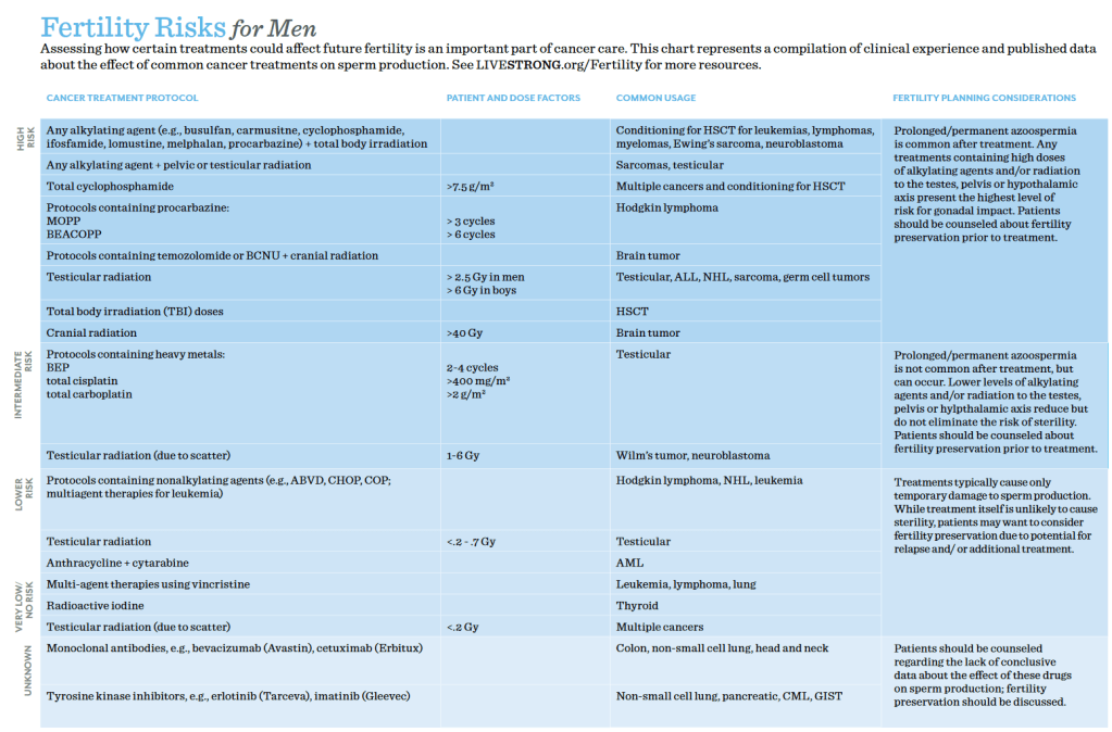 El grupo de quimioterapia alquilante hace el mayor daño a la fertilidad. Estos medicamentos incluyen ciclofosfamida (Cytoxan), clorambucil (Leukeran), busulfan (Myleran), procarbazina (Natulan, Matulane), nitrosoureas (Carmustine, Lomustine), mostaza nitrogenada (Mustargen) y mostaza L-fenilalanina (Alkeran). En dosis altas, la quimioterapia basada en platino (cisplatino, oxaliplatino) o medicamentos como la bleomicina (blenoxano, bleomicina), a menudo utilizados para tratar el cáncer testicular, también pueden afectar la fertilidad.