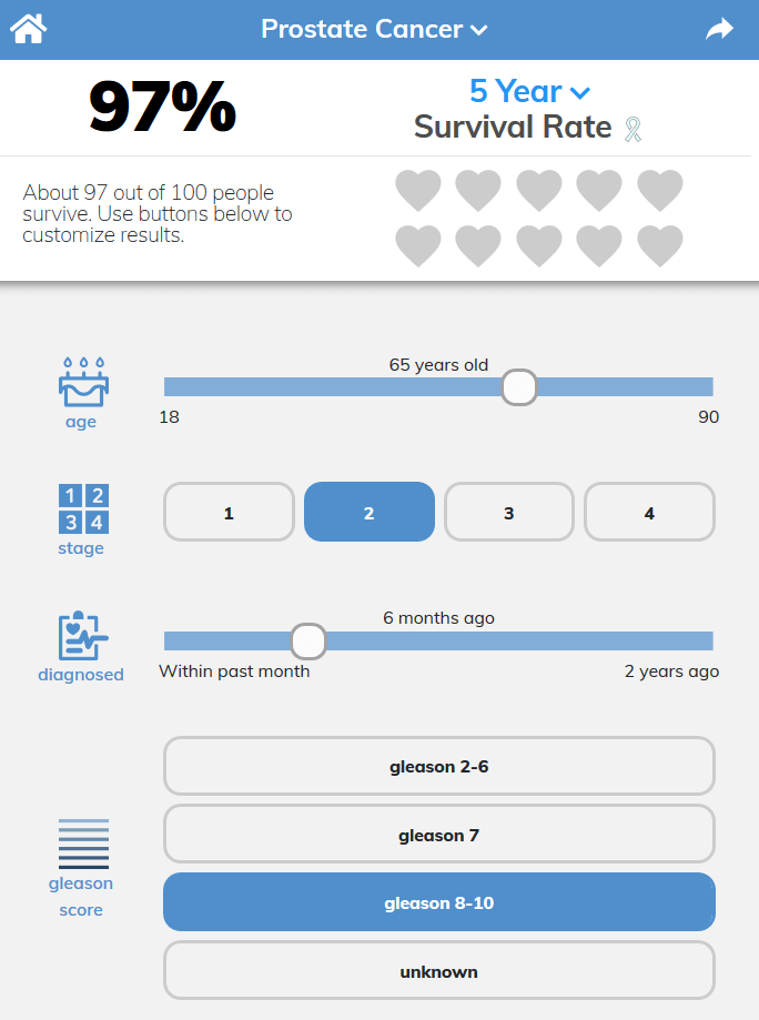 Una de nuestras herramientas favoritas es la desarrollada por Stephen Buck y su equipo en Courage Health ( https://courage.health/ ) llamada Cancer Survival Rates (Tasas de supervivencia en cáncer)