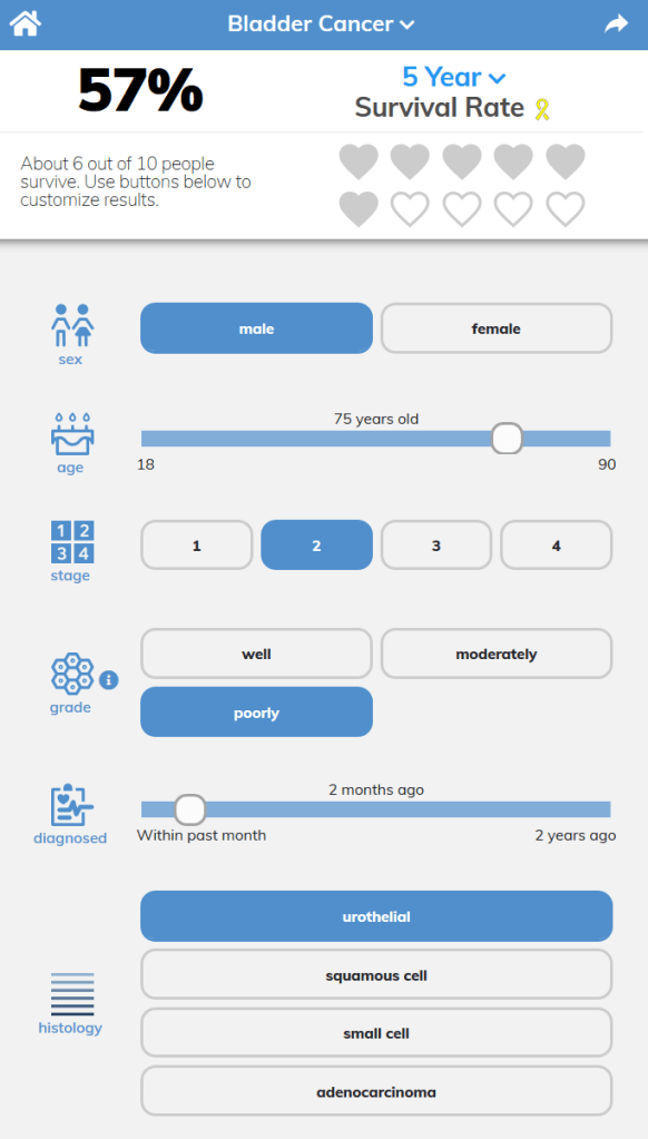 A continuación ponemos 2 ejemplos, el primero sería un paciente con Cáncer de vejiga, varón, de 75 años de edad, con un tumor urotelial pobremente diferenciado (alto grado), estadio 2, diagnosticado hace 2 meses. Este paciente tendría una tasa de supervivencia a 5 años del 57%.