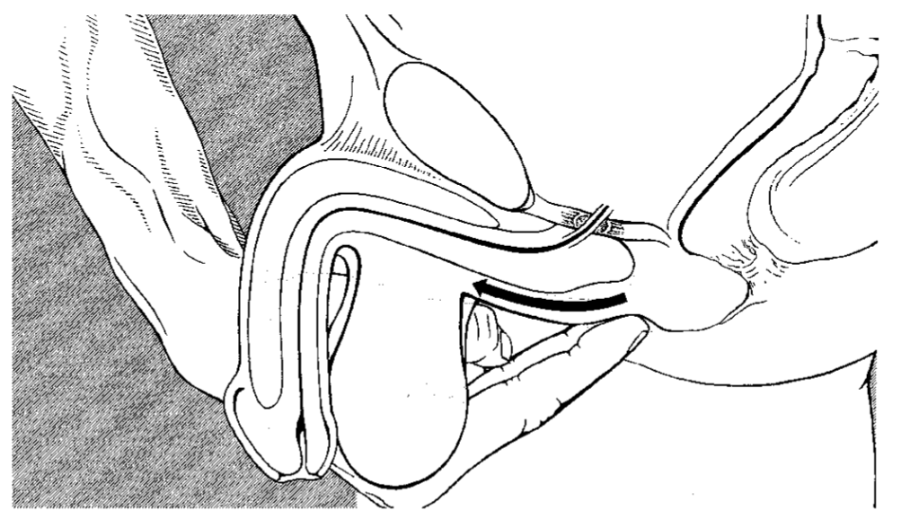 Se deben colocar los dedos detrás de su escroto inmediatamente después de orinar y suavemente masajear su uretra bulbar hacia adelante y hacia arriba en dirección hacia el pene.
