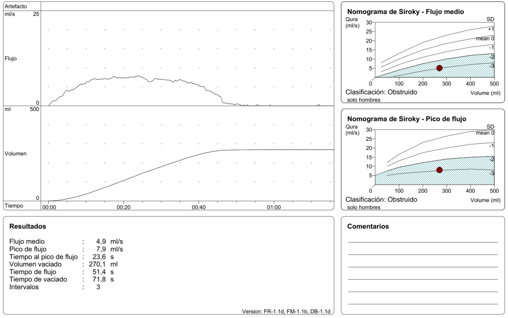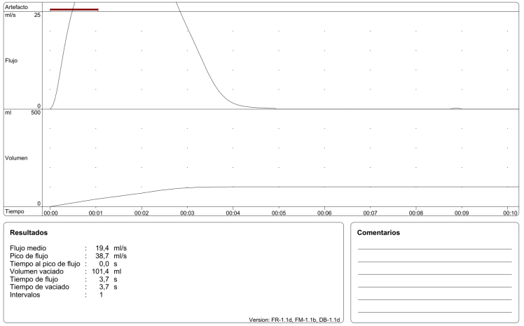 En la flujometría obtendremos distintos valores, inicialmente el más importante es el volumen vaciado, ya que se necesitan al menos 125-150ml para considerar la prueba como interpretable.