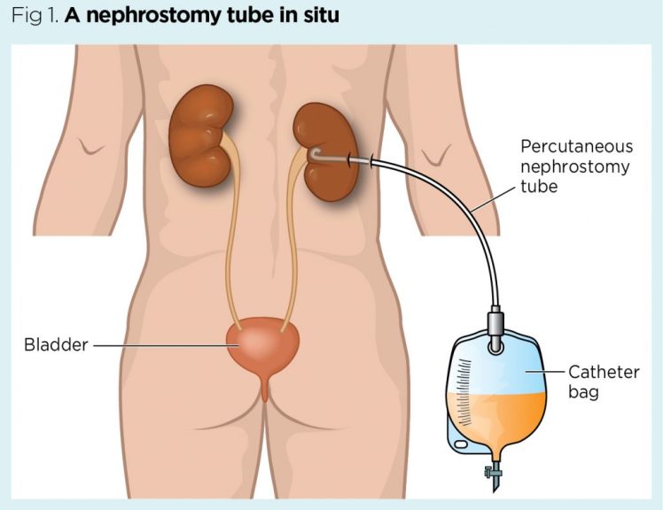 • El tubo de nefrostomía se fija a la piel de la espalda y se conecta a una bolsa o se deja a caída libre dentro de una bolsa de urostomía.