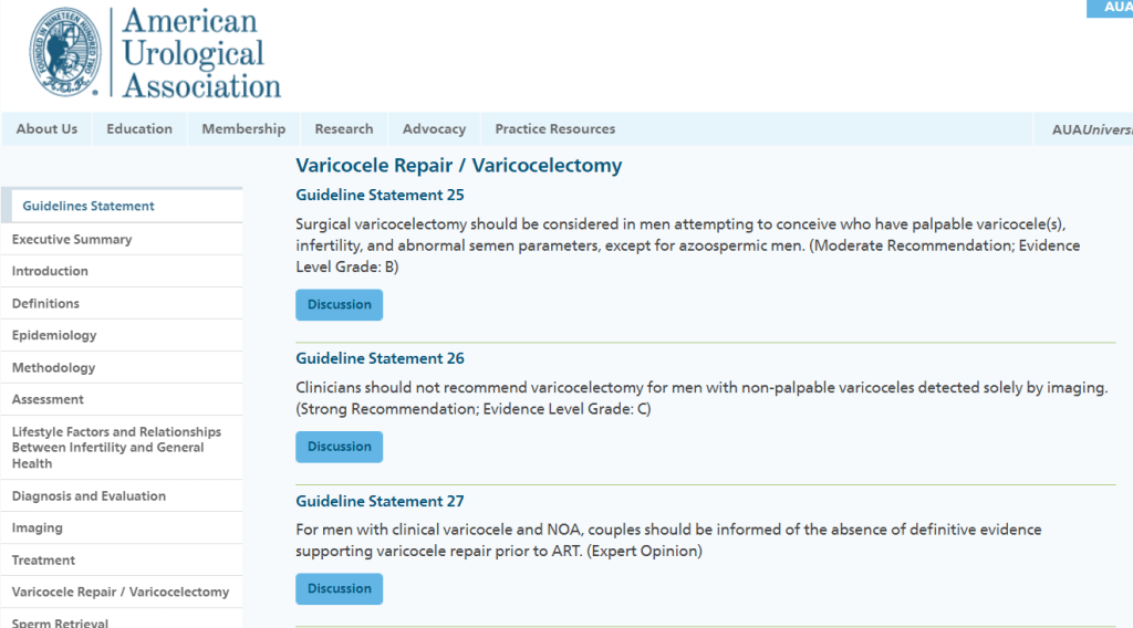 - La asociación americana (american urological association) en sus guías del 2020 refiere que se puede CONSIDERAR la reparación quirúrgica del varicocele en pacientes infértiles Y con parámetros seminales alterados (excepto azoospermia), con un nivel de evidencia B.
