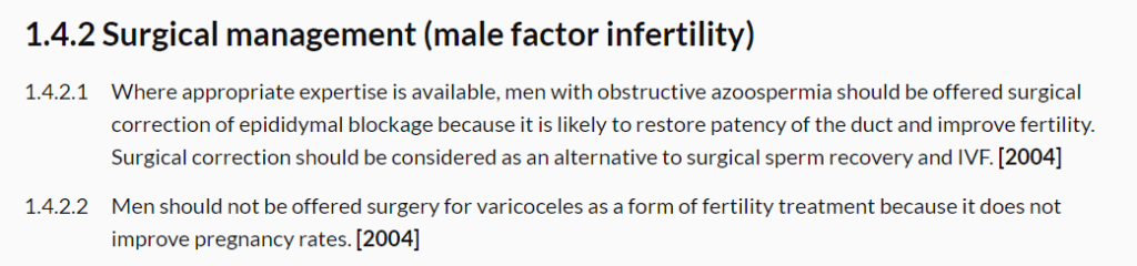 - Finalmente, las guías NICE del reino unido (2017) desaconsejan el ofrecer varicocelectomía a pacientes con infertilidad, dado que no ha demostrado aumentar la tasa de embarazos.